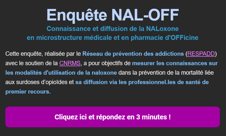 Le Réseau de Prévention des Addictions – RESPADD a réalisé une enquête afin de mesurer les connaissances sur les modalités d’utilisation de la naloxone dans la prévention de la mortalité liée aux surdoses d’opioïdes.